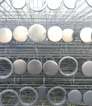 噴塑除塵器骨架是將焊接好的除塵骨架進行酸洗與磷化后,將油污、銹跡、灰塵等清洗干凈,在除塵骨架的外表面形成一層均勻而粗糙的不容易生銹的灰色磷化膜,既能防銹又能增加噴塑層的附著力。將除塵骨架利用電暈放電現(xiàn)象使塑粉吸附在工件表面形成厚度的粉末涂層,然后經(jīng)過180~220℃的烘烤,使塑粉熔化黏附在除塵骨架表面,形成一層保護層延長骨架的耐溫性與使用壽命。